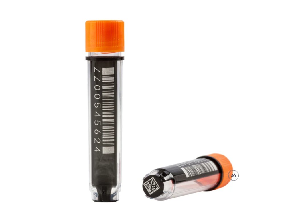 - permanently laser etched 2D code on base, 1D linear barcode and human readable number on the side, ensuring a permanent link between sample and data