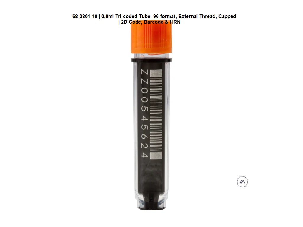 | 0.8ml Tri-coded Tube, 96-format, Internal Thread 2D code on base, 1D linear barcode and human readable number on side | |
