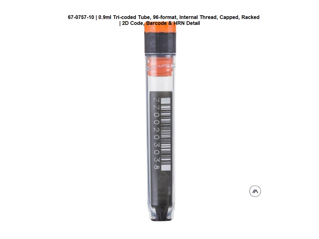| 0.9ml Tri-coded Tube, 96-format, Internal Thread 2D code on base, 1D linear barcode and human readable number on side | |