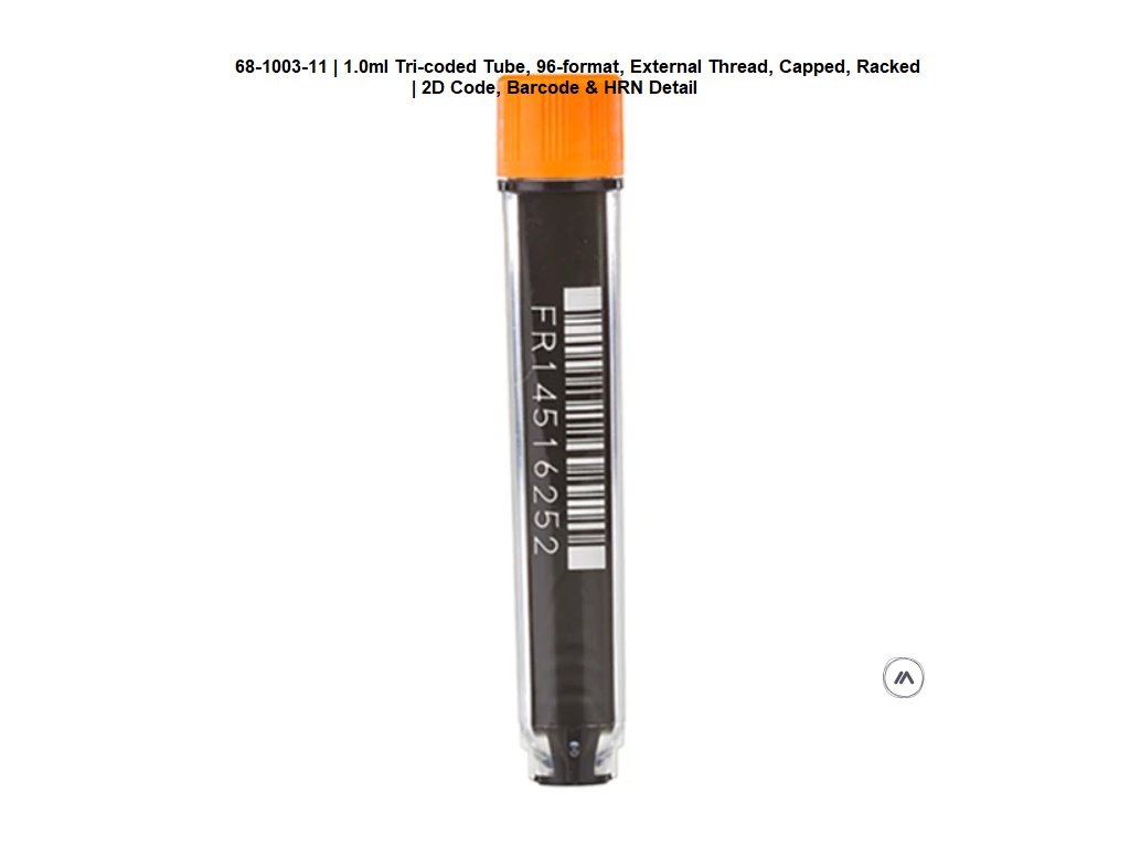 | 1,0ml Tri-coded Tube, 96-format, Internal Thread 2D code on base, 1D linear barcode and human readable number on side | |