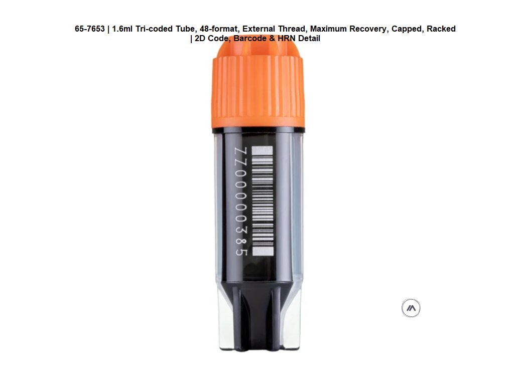 | 1.6ml Tri-coded Tube, 48-format, External Thread, Maximum Recovery, 48-format, external thread, 2D code on base, 1D linear barcode and human readable code on side | |