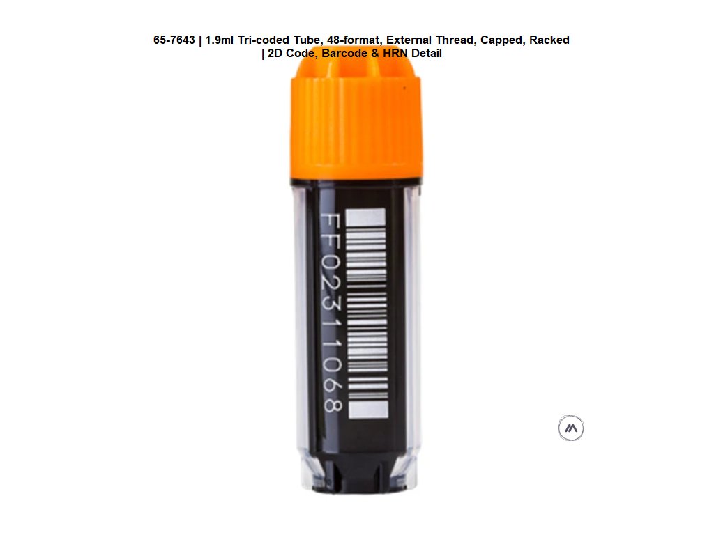 | 1,9ml Tri-coded Tube, 48-format, Internal Thread 2D code on base, 1D linear barcode and human readable number on side | |