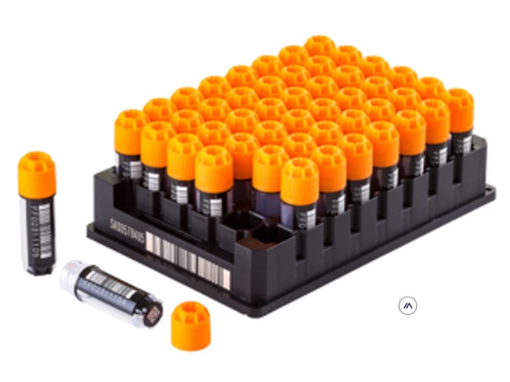 - permanently laser etched 2D code on base, 1D linear barcode and human readable number on the side, ensuring a permanent link between sample and data